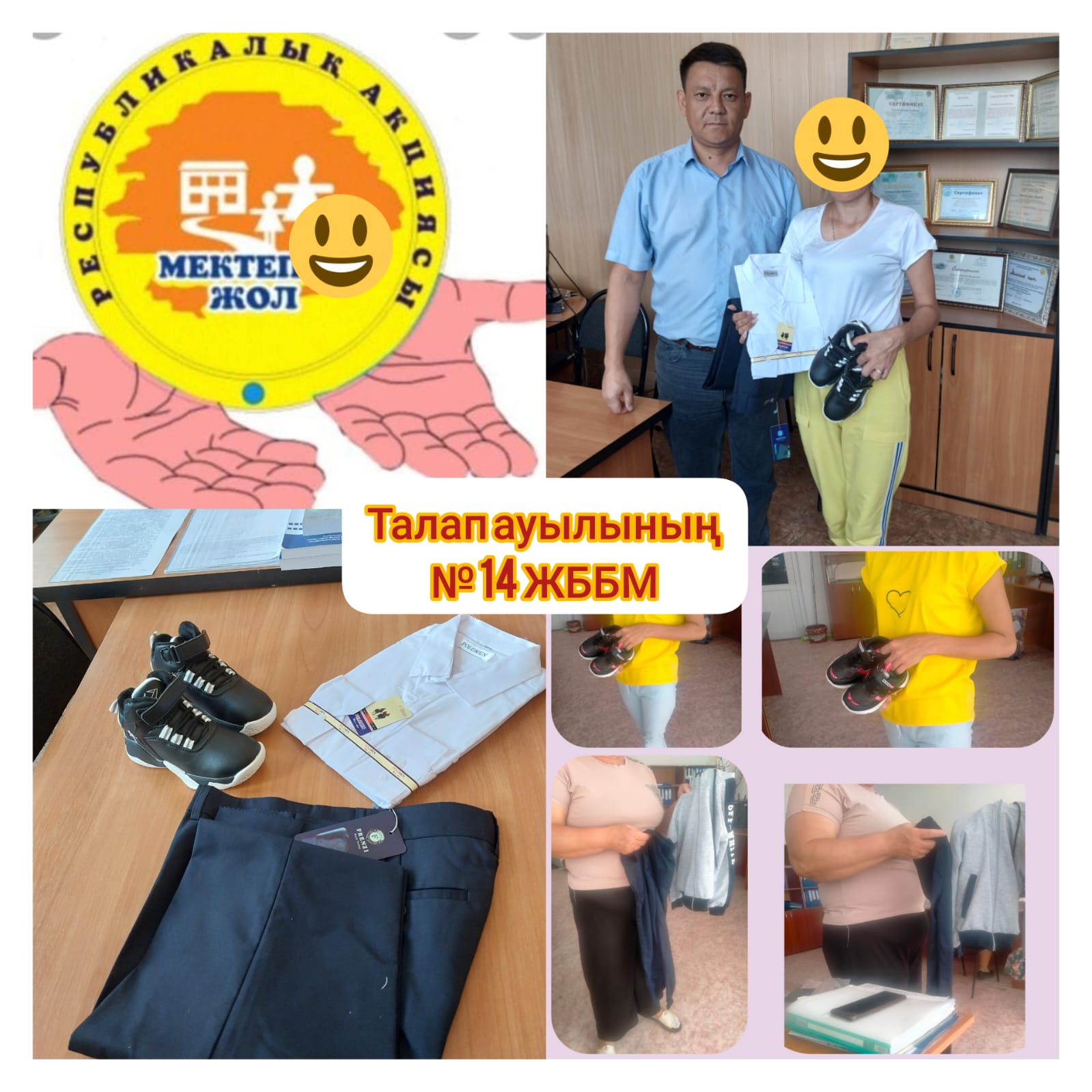 "Мектепке жол" акциясы бойынша мектебіміздің 2 отбасының 4 оқушысына демеушілер тарапынан мектеп және спорттық форма мен аяқ киім сыйға тартылды.