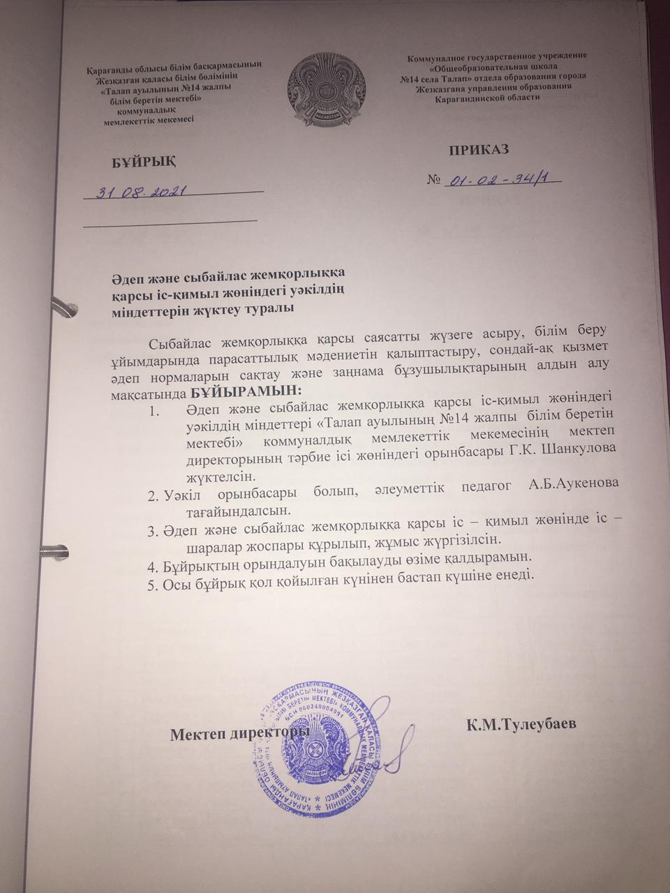 Әдеп және сыбайлас жемқорлыққа қарсы іс-қимыл жөніндегі уәкілдің міндеттерін жүктеу туралы бұйрық