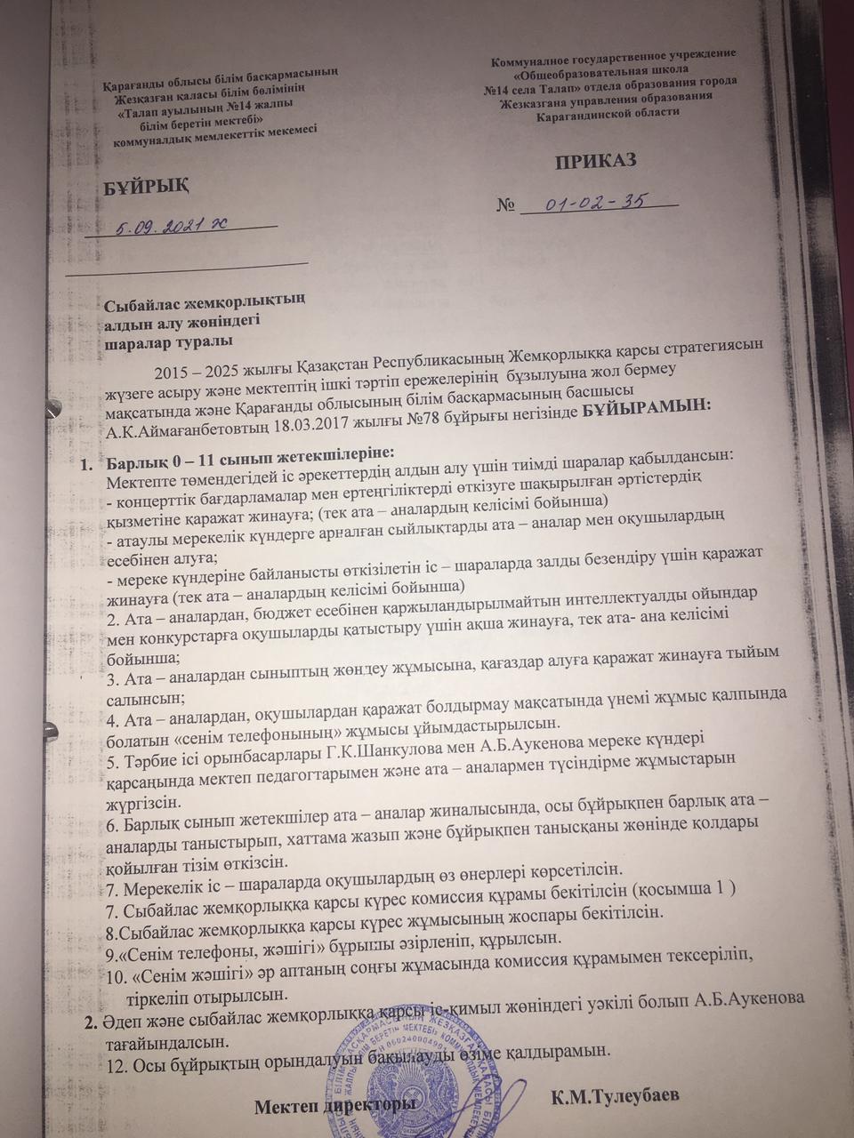 Сыбайлас жемқорлықтың алдын алу жөніндегі шаралар туралы бұйрық