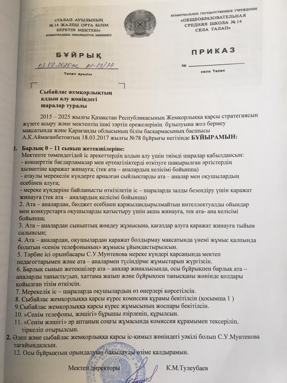Сыбайлас жемқорлықтың алдын алу жөніндегі шаралар туралы бұйрық
