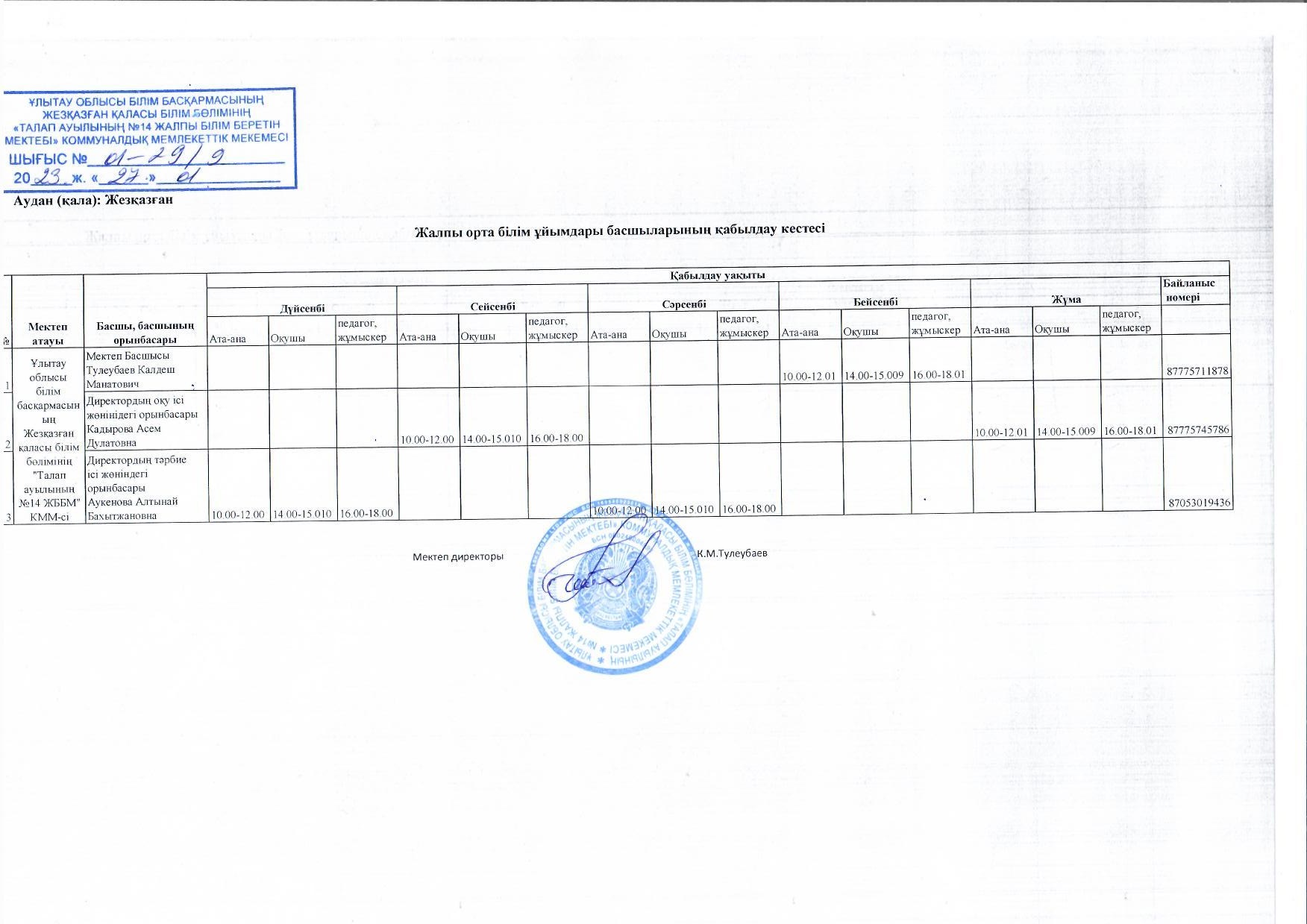 Мектеп директоры және директордың орынбасарларының мектеп қызметкерін, ата-аналарды, және оқушыларды қабылдау кестесі