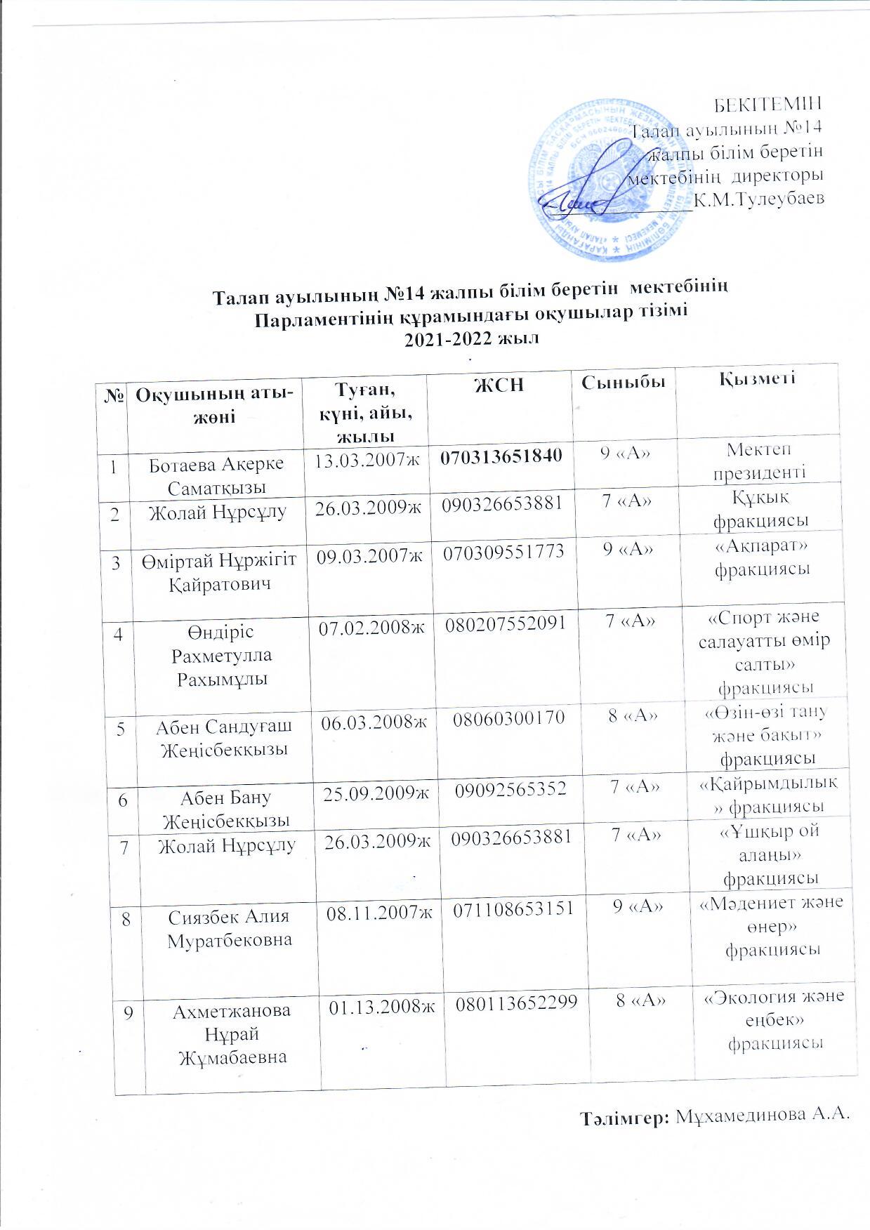 Парламент құрамындағы оқушылар тізімі 2021-2022